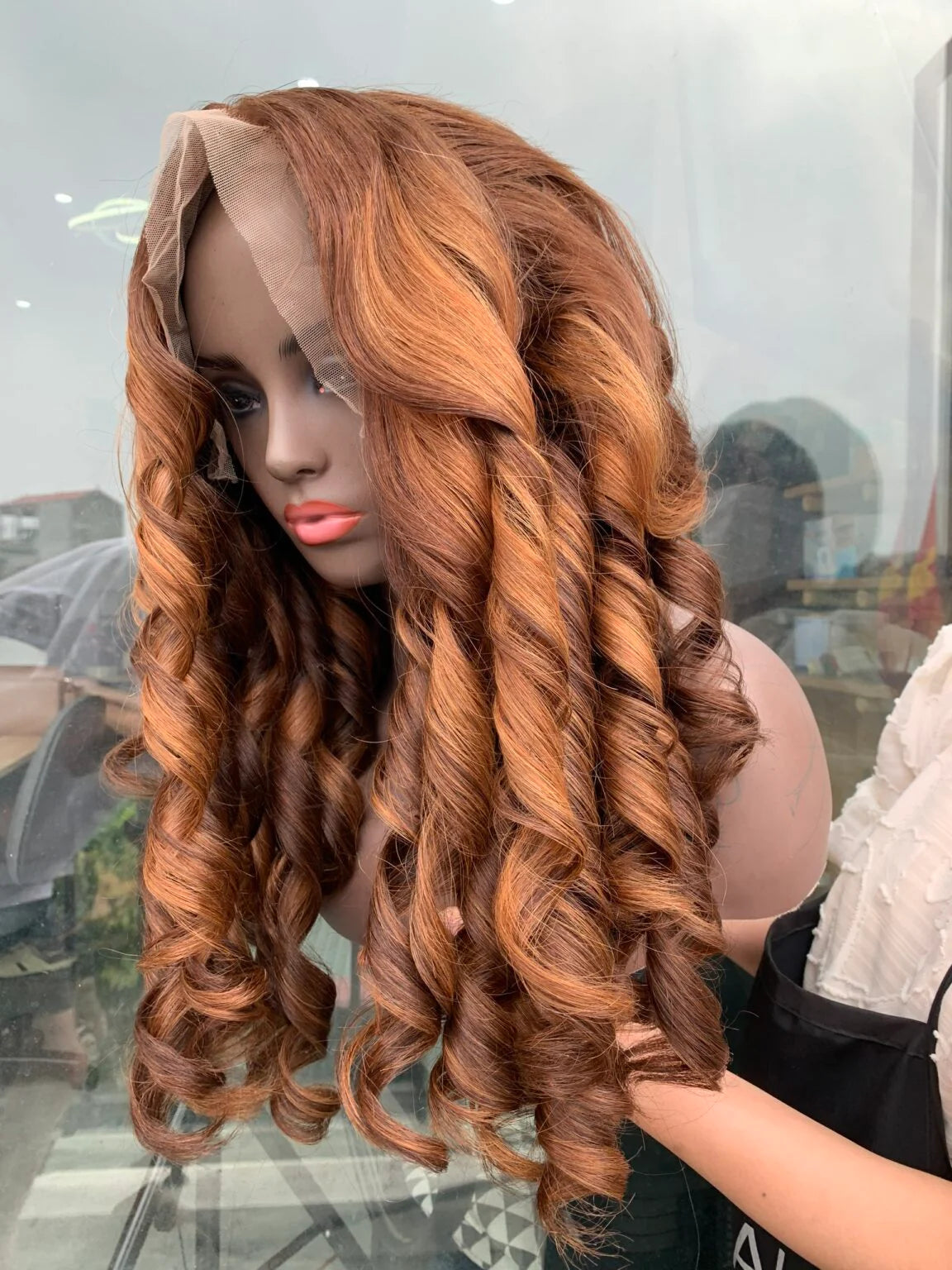 Cleo, a stunning 22” two-tone warm blonde lace frontal wig designed for rich color depth and voluminous curls. Made from super double drawn Remy hair, this unit offers fullness from root to tip, delivering a naturally thick and glamorous appearance.