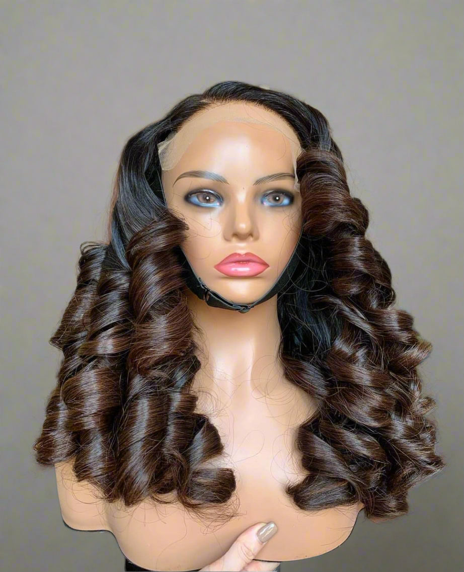 Stunning luxury brown balayage lace closure wig, featuring beautifully voluminous curls and a natural hairline for an undetectable finish. The HD transparent lace ensures a seamless blend with all skin tones, while the deep brown hues transition into soft caramel highlights for a dimensional and natural look.